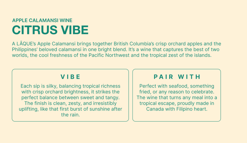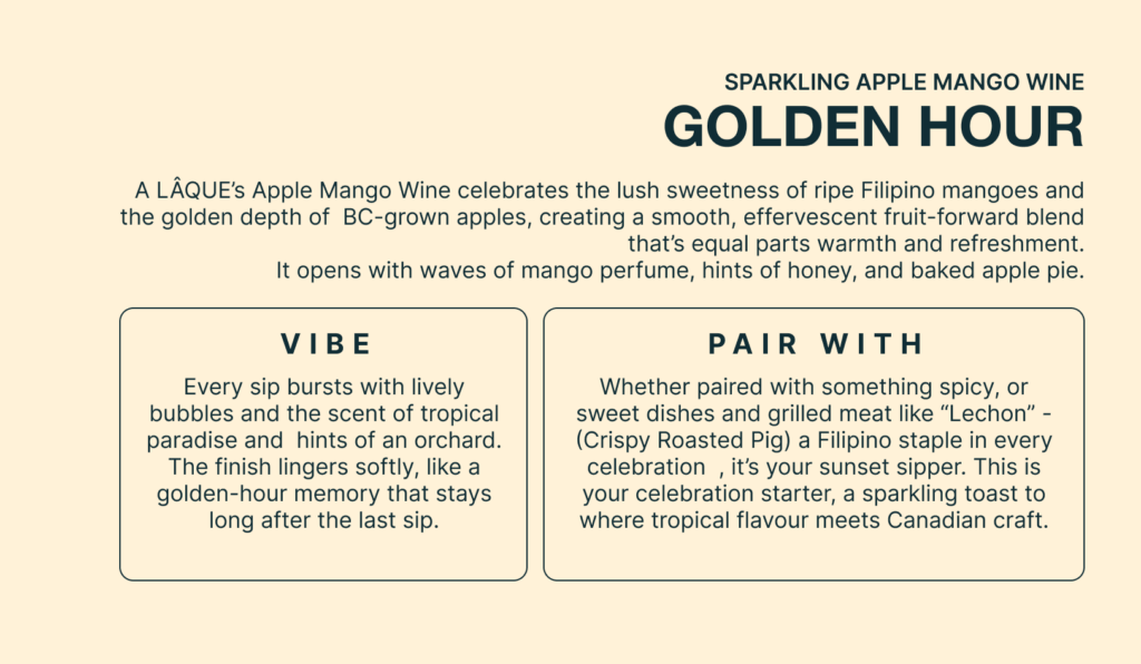 Crafted with BC’s crisp orchard apples and infused with the bold flavours of calamansi and  mango, our wines bring two worlds together in every pour. Bright, refreshing, and full of  character, they’re made for moments worth celebrating, however you celebrate. Proudly  produced at Okanagan Crush Pad.