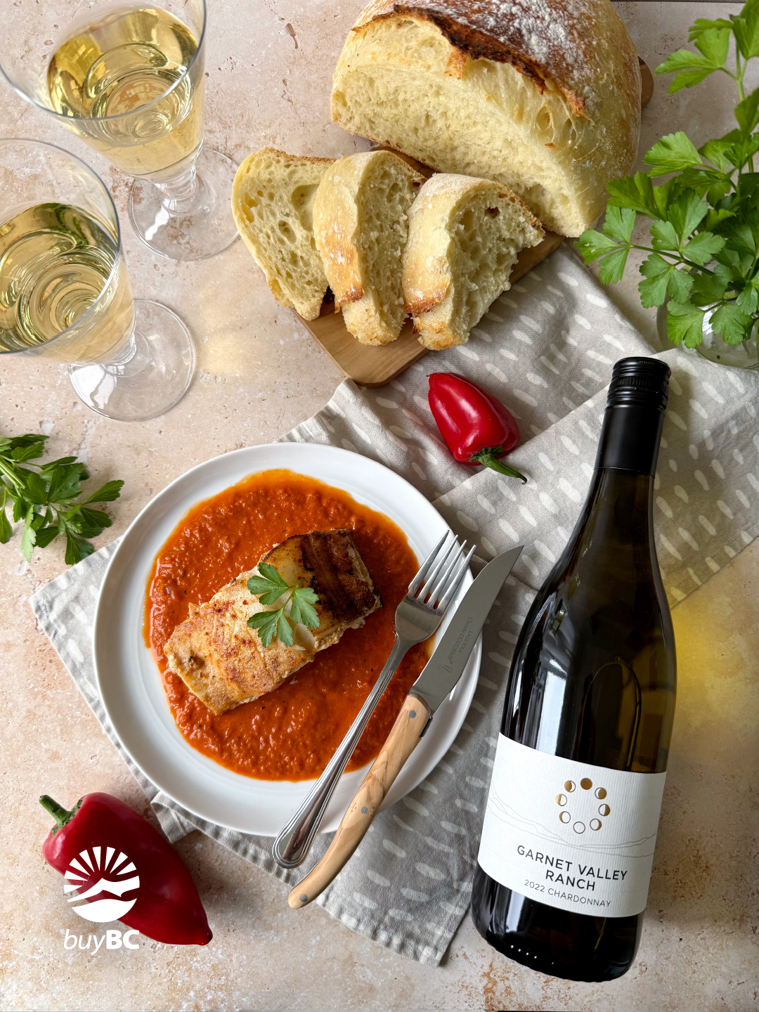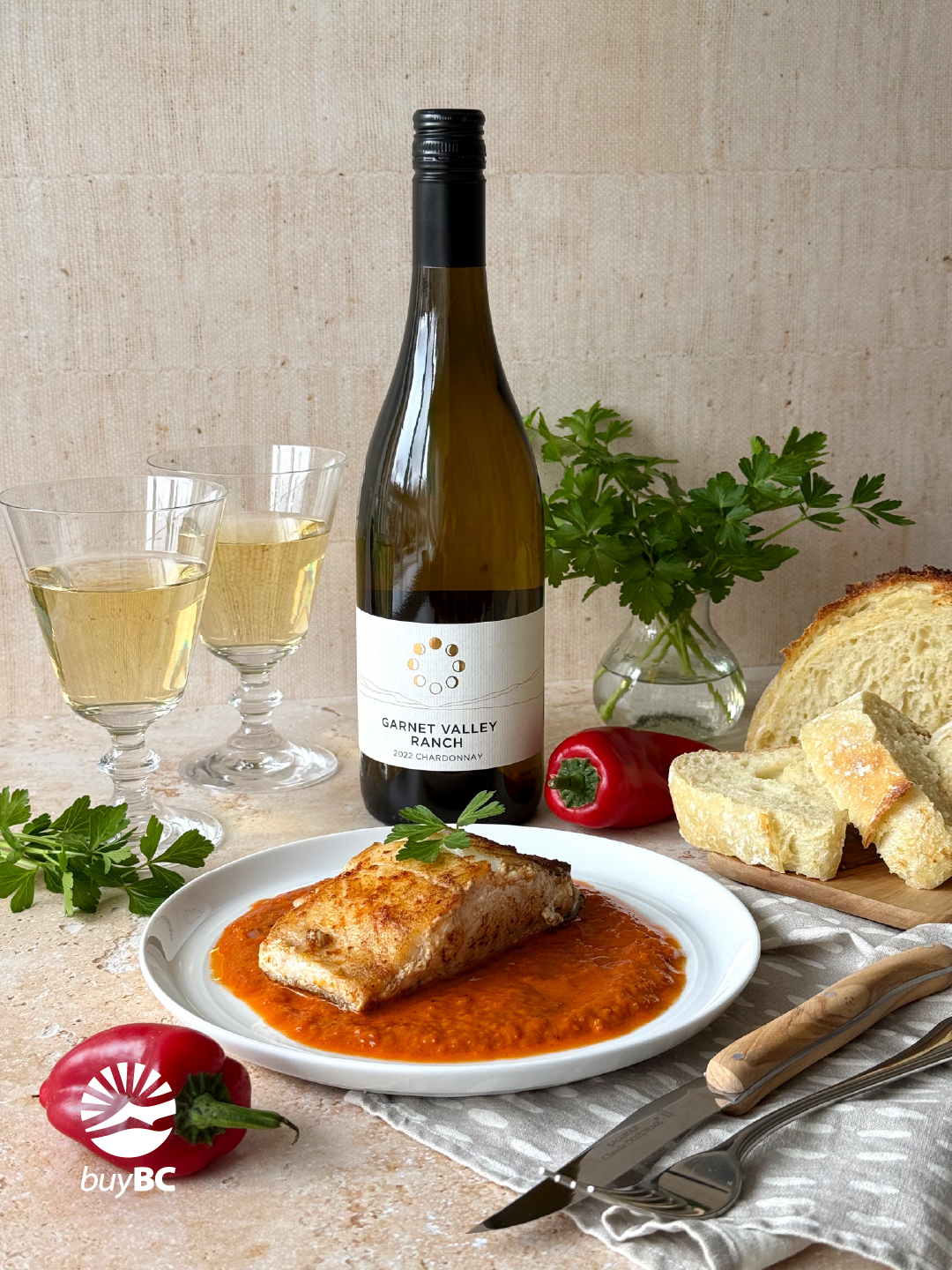 There are few pairings that capture the character of Garnet Valley Ranch Chardonnay quite like fresh seafood. In this dish, Chef Melissa Leung brings together pan-seared lingcod and a vibrant roasted red pepper sauce to highlight the wine’s balance of richness and bright acidity.