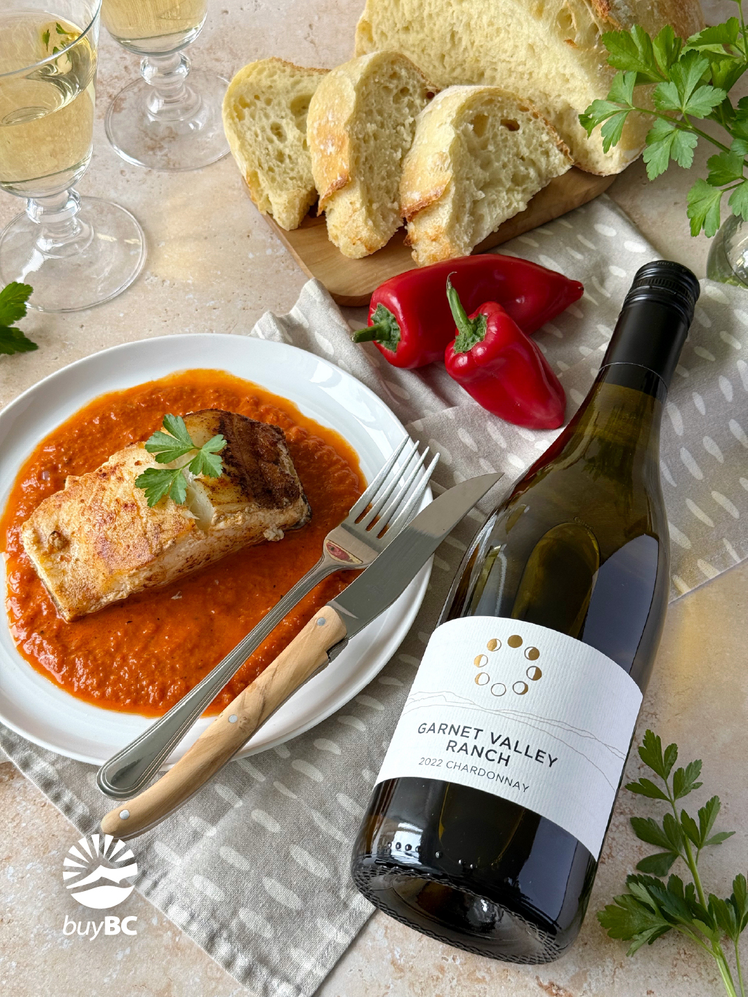 - Spoon the red pepper sauce onto plates, then top with the lingcod and a sprig of parsley. Serve immediately with a glass of chilled Garnet Valley Ranch 2022 Chardonnay and enjoy!